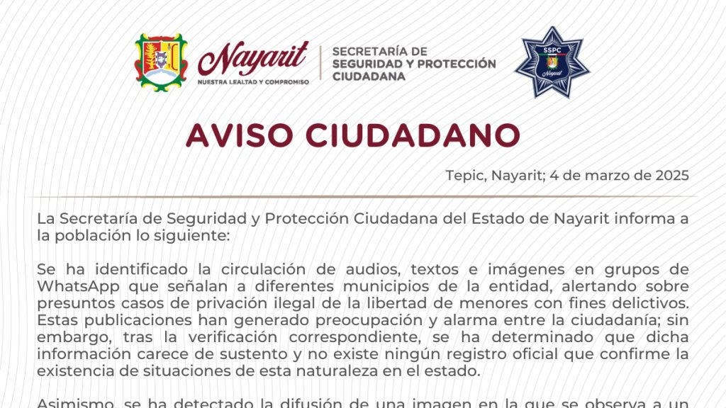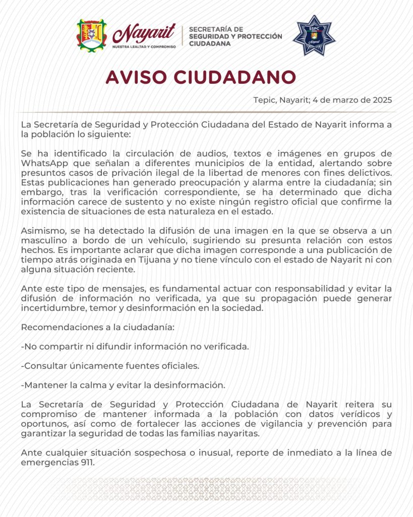 Tepic, Nayarit. La Secretaría de Seguridad y Protección Ciudadana de Nayarit informó que los mensajes difundidos en redes sociales y grupos de WhatsApp sobre presuntos casos de privación ilegal de la libertad de menores en distintos municipios del estado no tienen sustento y no existen registros oficiales que confirmen estos hechos.