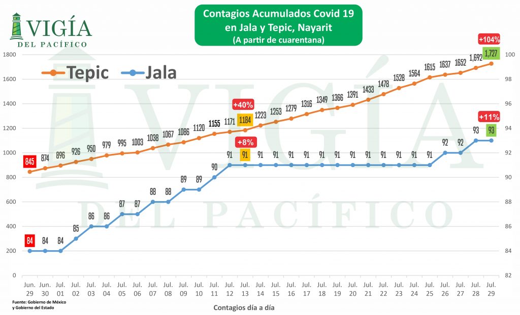 1️⃣ La cuarentena impuesta por el Gobierno de Nayarit en el municipio de Jala (del 29 de junio al 16 de julio),😷 a un mes de su inicio los resultados que arroja la vuelta a la nueva normalidad señalan que en el municipio incrementaron los contagios acumulados 🤧 pues de 84 casos registrados ese 29 de junio se llegó a 93 un mes después,🤔 siendo un 11% el crecimiento🔝. Tepic por su parte hace un mes tenía 845 casos de contagio y ahora alcanza 1,727 acumulados, esto es un 104% más🔝.