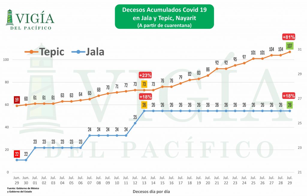 2️⃣ En el caso de los fallecimientos en la capital del estado se tenían hace un mes 59 defunciones y para el corte al 29 de julio alcanzaron 107 lamentables muertes⚰️, un incremento de 81%.🔝 Mientras que para Jala el 29 de junio se contaban 22, y para el 29 de julio la cifra alcanzó 26 decesos representando un incremento de 18%; ⚱️ es de resaltar que esta cifra de 26 se tuvo desde el 13 de julio, esto es que una quincena no hubo movimiento en ese renglón🚫.