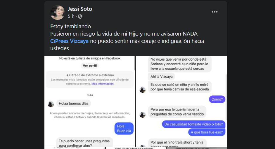 Una joven mujer denunció a través de redes sociales el descuido de la escuela CiPrees Vizcaya, en el que su hijo salió del inmueble sin que nadie se diera cuenta y estuviera en riesgo al cruzar la calle.