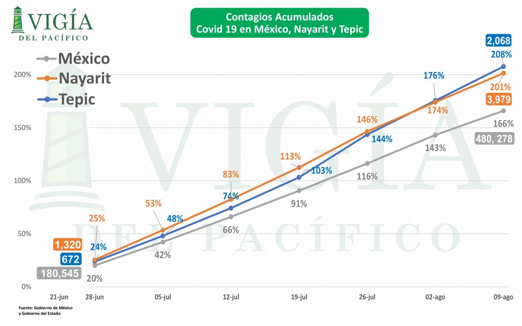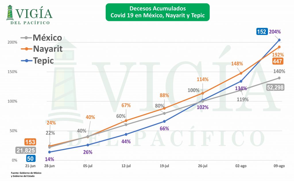 Tepic y Nayarit, con mayor crecimiento porcentual de casos de contagios y decesos por Covid que México como país.
