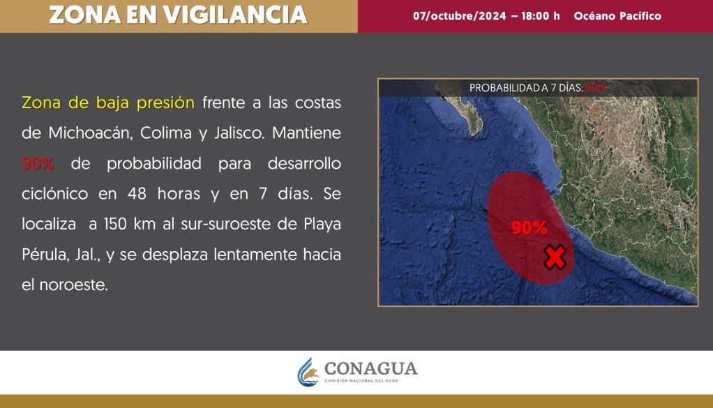 Se trata de una zona de baja presión que se desplazará frente a costas de Colima, Jalisco y Nayarit, y que podría generar lluvias muy fuertes en la región, así como rachas de viento de entre 40 y 60 kilómetros por hora.